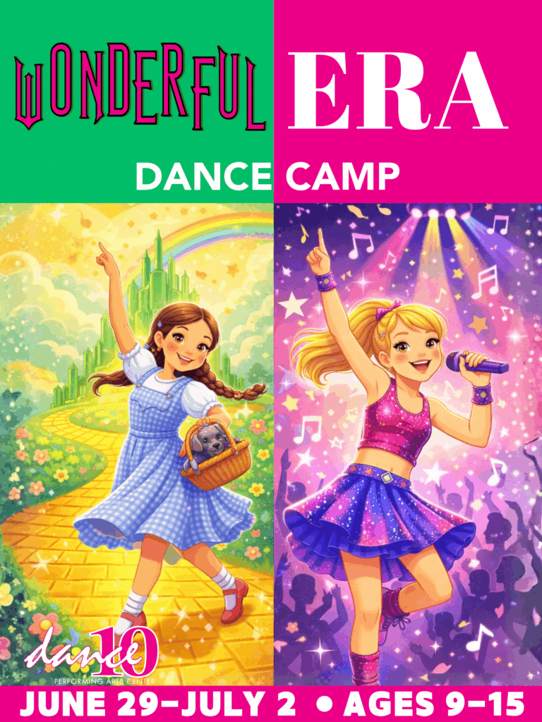 Step into a Wonderful Era, where theatrical storytelling meets pop-star performance. In this high-energy, four-day dance camp, dancers will spend two days exploring expressive, character-driven choreography inspired by Oz and Wicked, and two days focused on bold, pop-driven routines inspired by Taylor Swift’s music and performance style.
